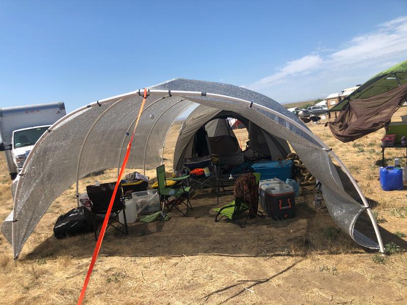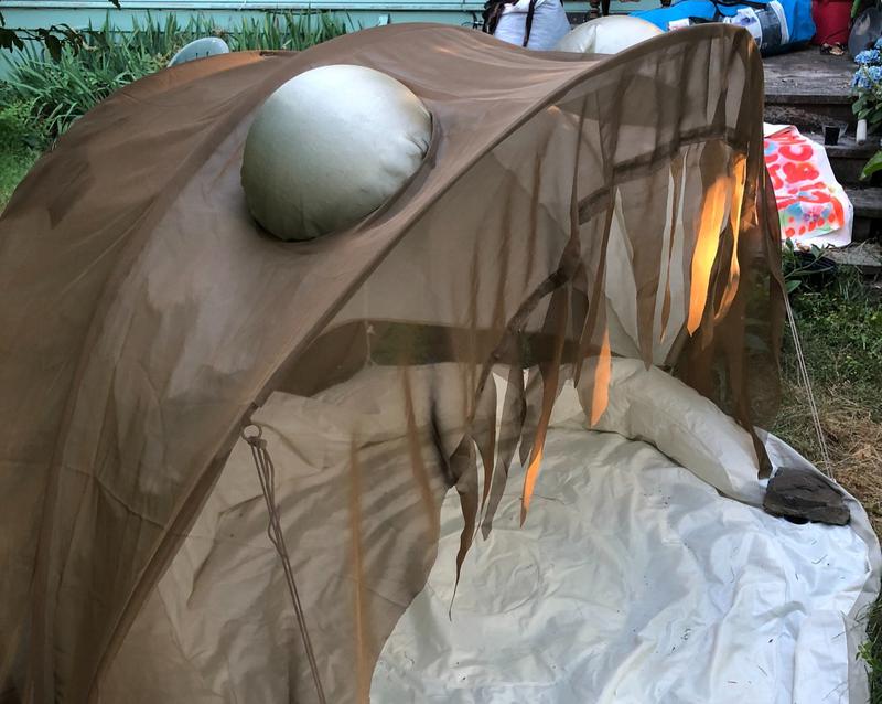 30th July 2018 Disco Den A "monkey hut" I designed and built. It is an excellent shade structure for festivals that can withstand immense wind!